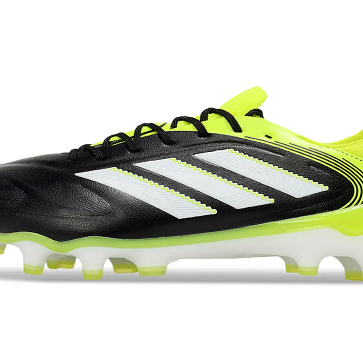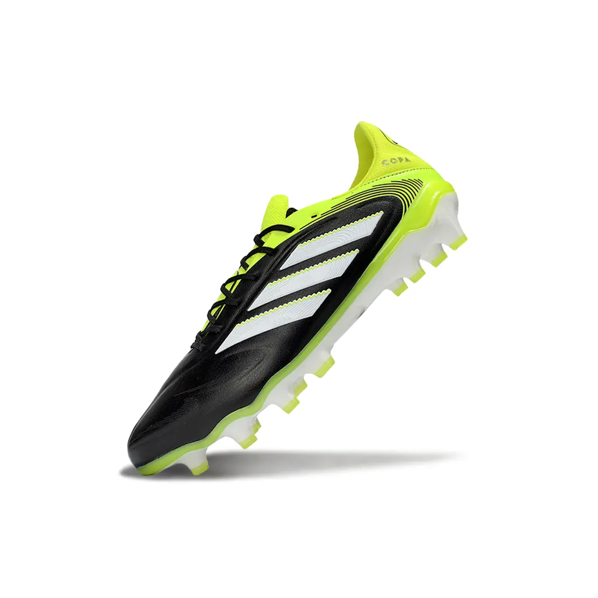 A Adidas Copa Pure II Elite FG une o melhor do estilo retrô com tecnologias atuais para entregar uma chuteira de toque refinado, conforto absoluto e controle total. Nesta versão em preto com detalhes verdes, ela exala elegância com um toque ousado – perfeita para quem joga com inteligência e personalidade.