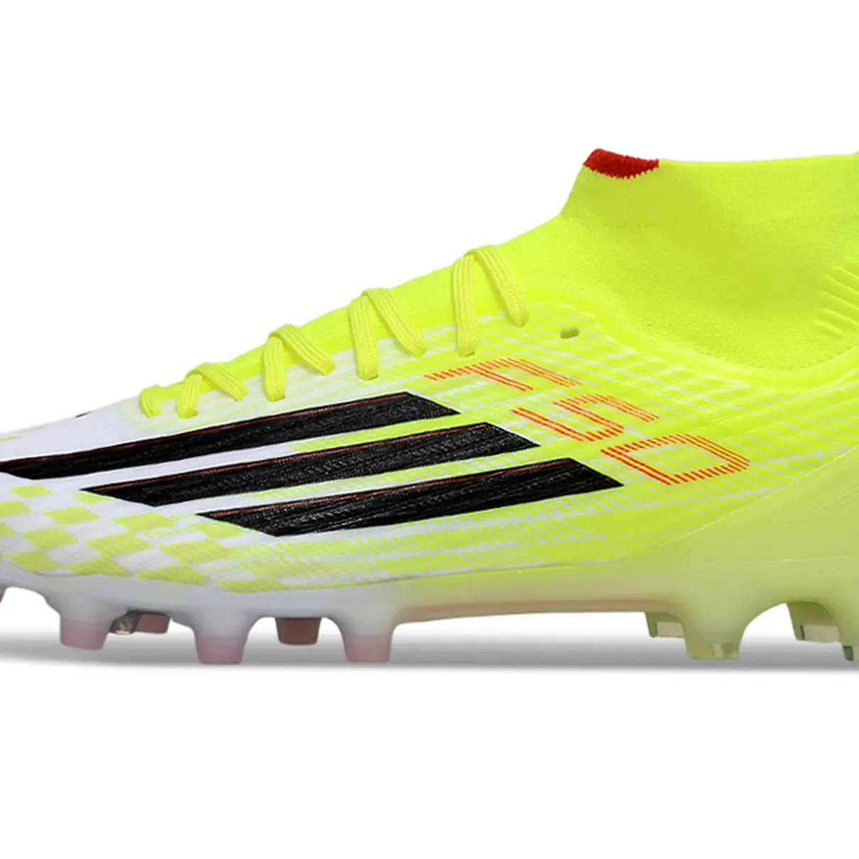 Colarinho de Cano Médio (Primeknit): A estrutura em malha elástica envolve o tornozelo como uma meia, proporcionando suporte adicional e uma conexão perfeita entre a perna e a chuteira, sem restringir a liberdade de movimento.