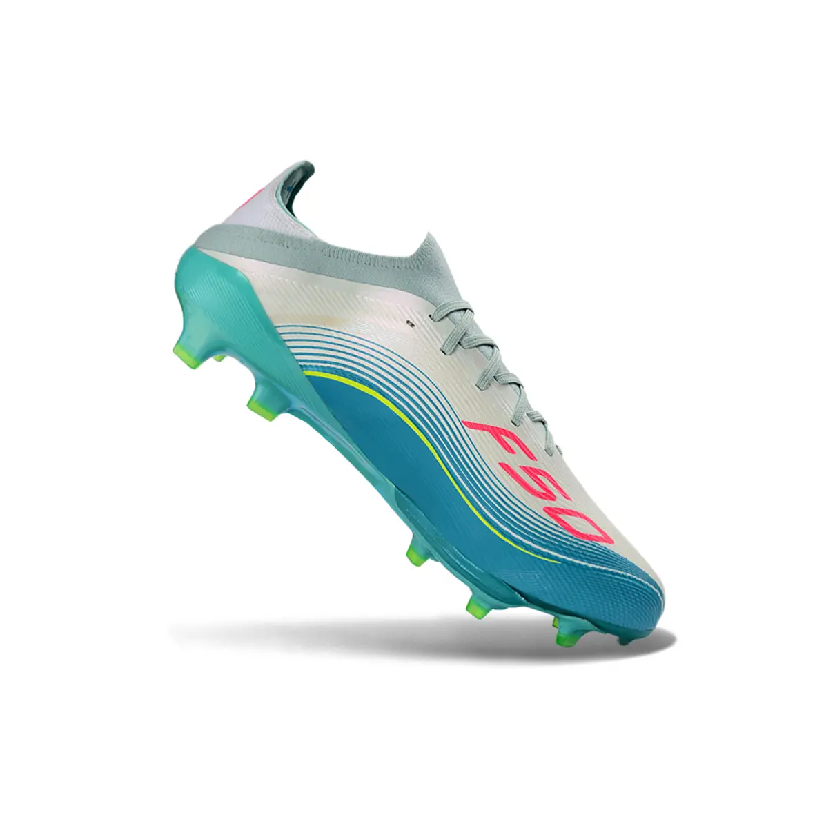 A Chuteira Campo Adidas F50+ FG Bege, Azul e Verde – Messi foi desenvolvida para jogadores que buscam velocidade, explosão e controle de bola em gramados naturais. Inspirada no estilo de jogo de Lionel Messi, essa chuteira combina leveza e tecnologia para ajudar em arrancadas rápidas, dribles curtos e mudanças de direção.