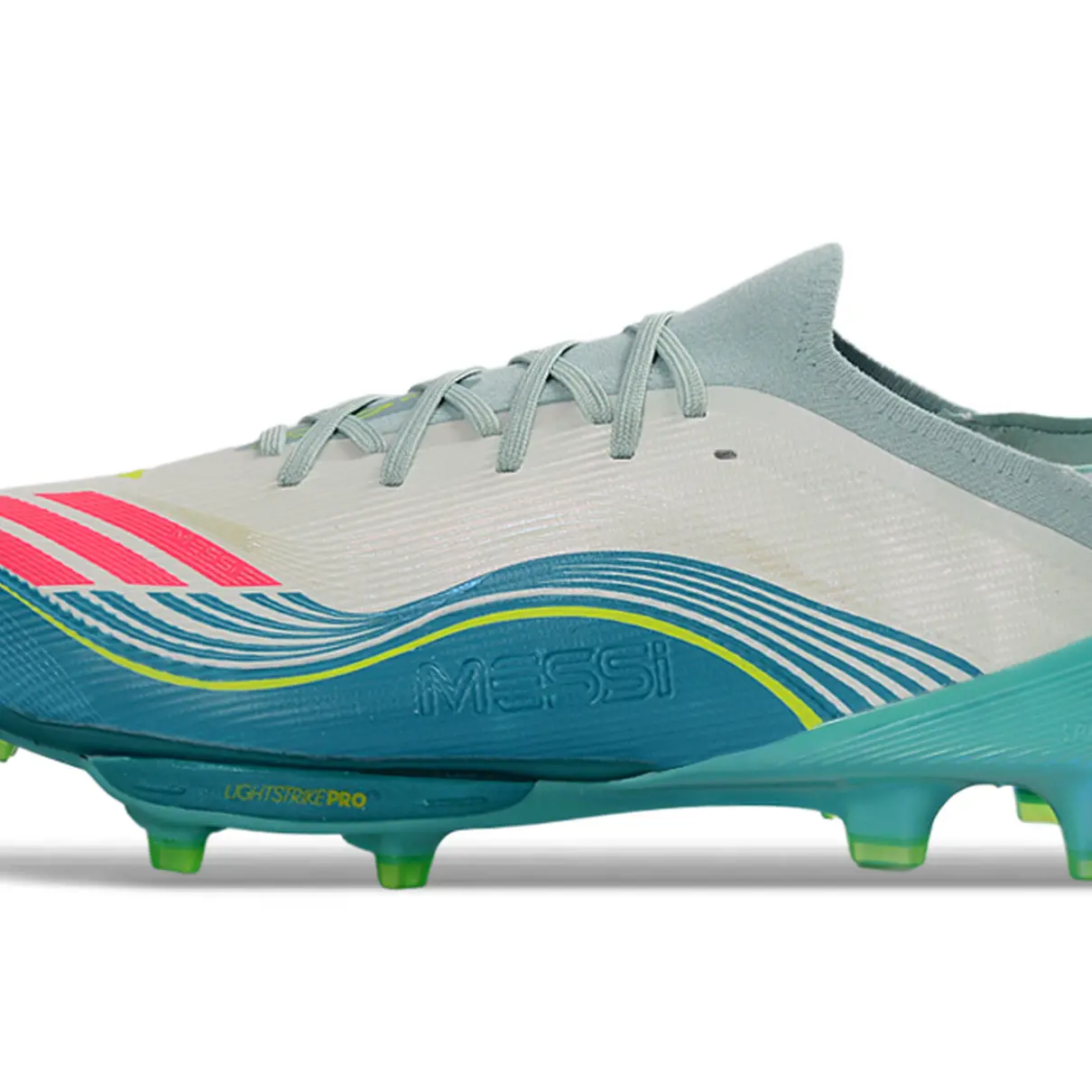 Chuteira Campo Adidas F50+ FG Bege, Azul e Verde – Messi