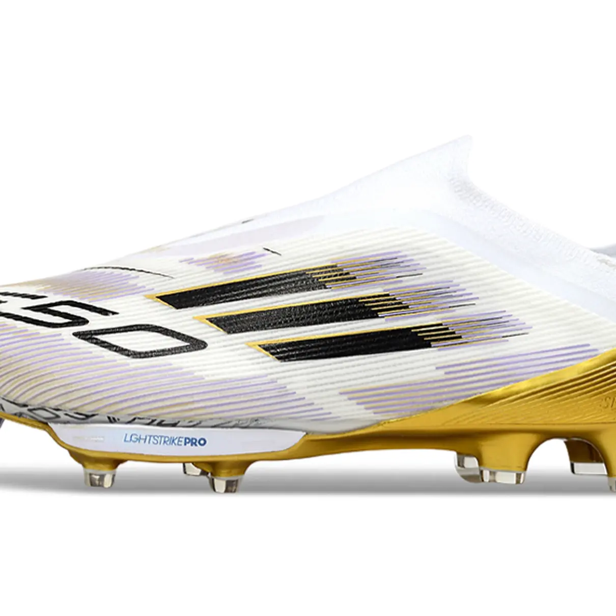 A Adidas F50+ LL FG Branco e Dourado é uma fusão de luxo e performance. Com design imponente e acabamento metálico dourado, essa chuteira foi feita para jogadores que querem se destacar não só pelo talento, mas também pelo visual.