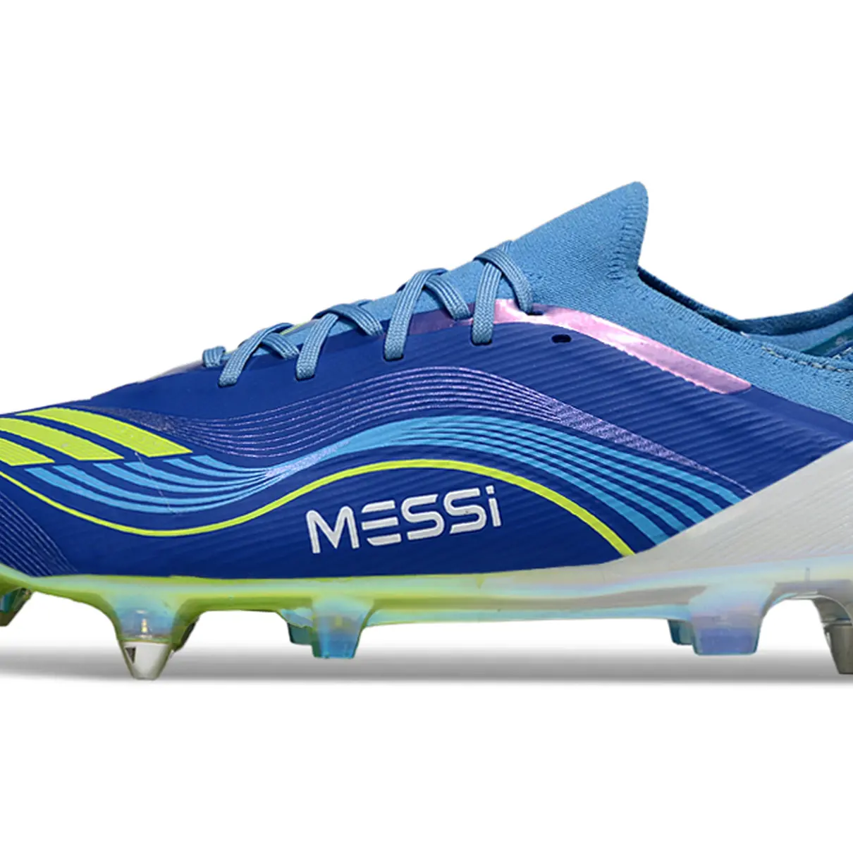 A Chuteira Campo Adidas F50 Ponta de Alumínio Azul e Verde "Messi" foi desenvolvida para jogadores que buscam velocidade, leveza e precisão nas partidas. Inspirada no estilo explosivo de Lionel Messi, essa versão combina cabedal leve e aerodinâmico com ajuste confortável e excelente sensação de toque na bola. As travas de alumínio removíveis garantem máxima tração e estabilidade em gramados naturais, enquanto o design vibrante em azul e verde transmite a energia e o brilho característicos do craque argentino.