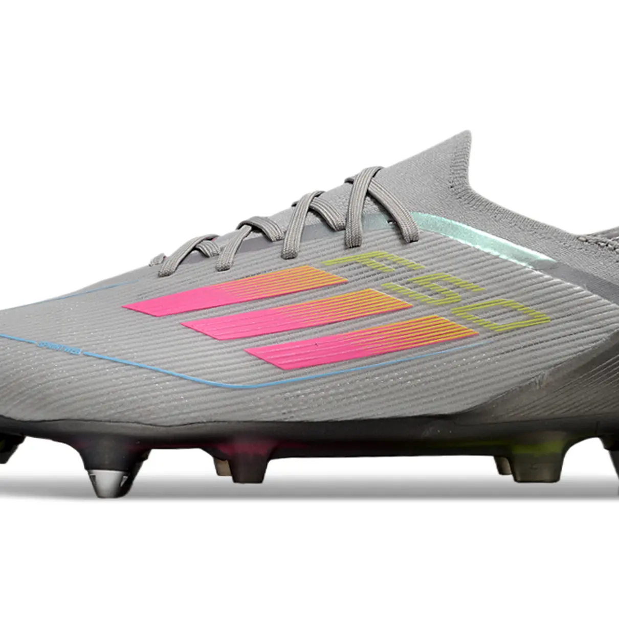 Projetada para gramados naturais, a F50 conta com cabedal sintético texturizado que oferece excelente contato com a bola. Já as travas de alumínio removíveis proporcionam tração firme e estável, ideal para cortes rápidos, piques curtos e viradas de direção em terrenos macios ou úmidos.