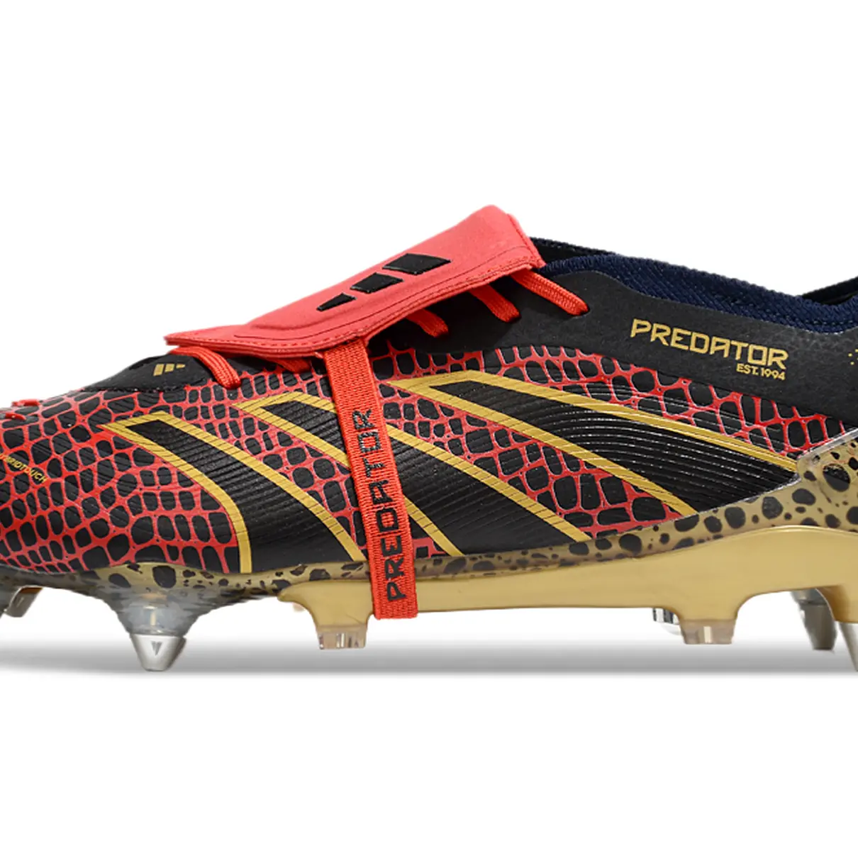 A Adidas Predator Elite FT 30 nas cores preto, vermelho e dourado entrega uma combinação poderosa de desempenho, estilo e autoridade em campo. Com design marcante e acabamento premium, essa chuteira foi feita para quem comanda as ações com precisão e confiança.