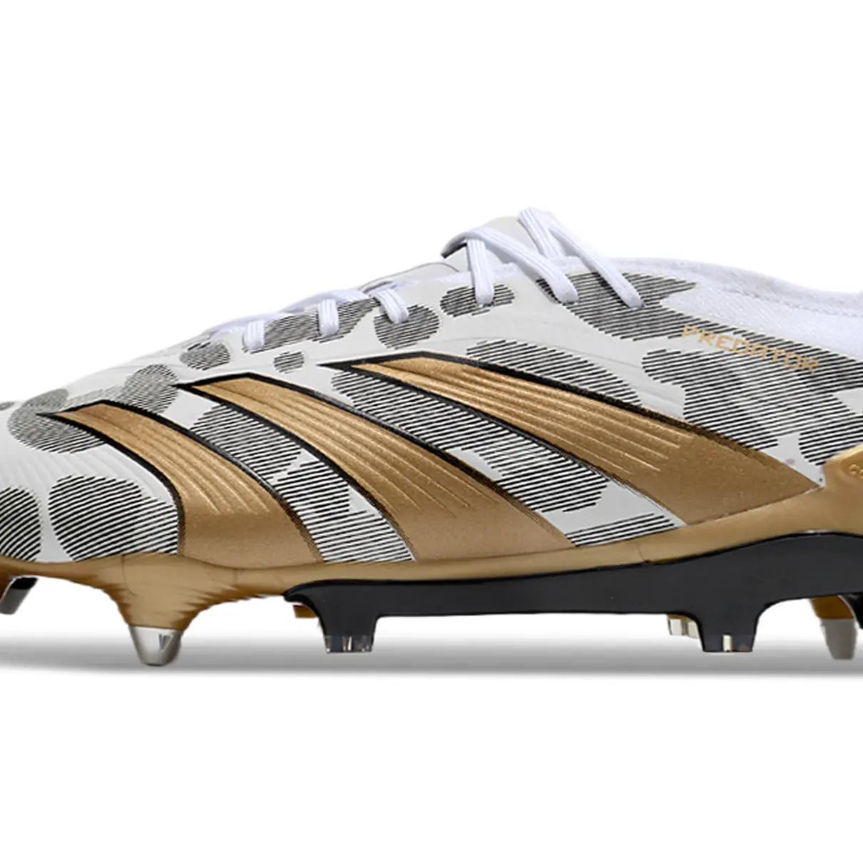 Eleve sua performance com a elegância e tecnologia da Adidas Predator Elite. Com um design sofisticado nas cores branco, dourado e cinza, essa chuteira oferece não só estilo, mas também o máximo em controle e conforto.