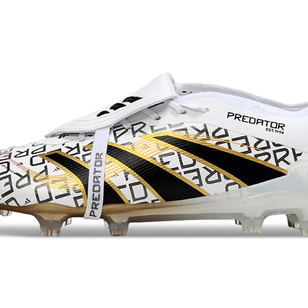 A Predator FT 30 Elite FG chega em uma combinação luxuosa de branco, preto e dourado, perfeita para quem se destaca em campo com técnica e estilo. O cabedal sem cadarços garante controle absoluto da bola e um toque limpo, ideal para passes precisos e finalizações letais.