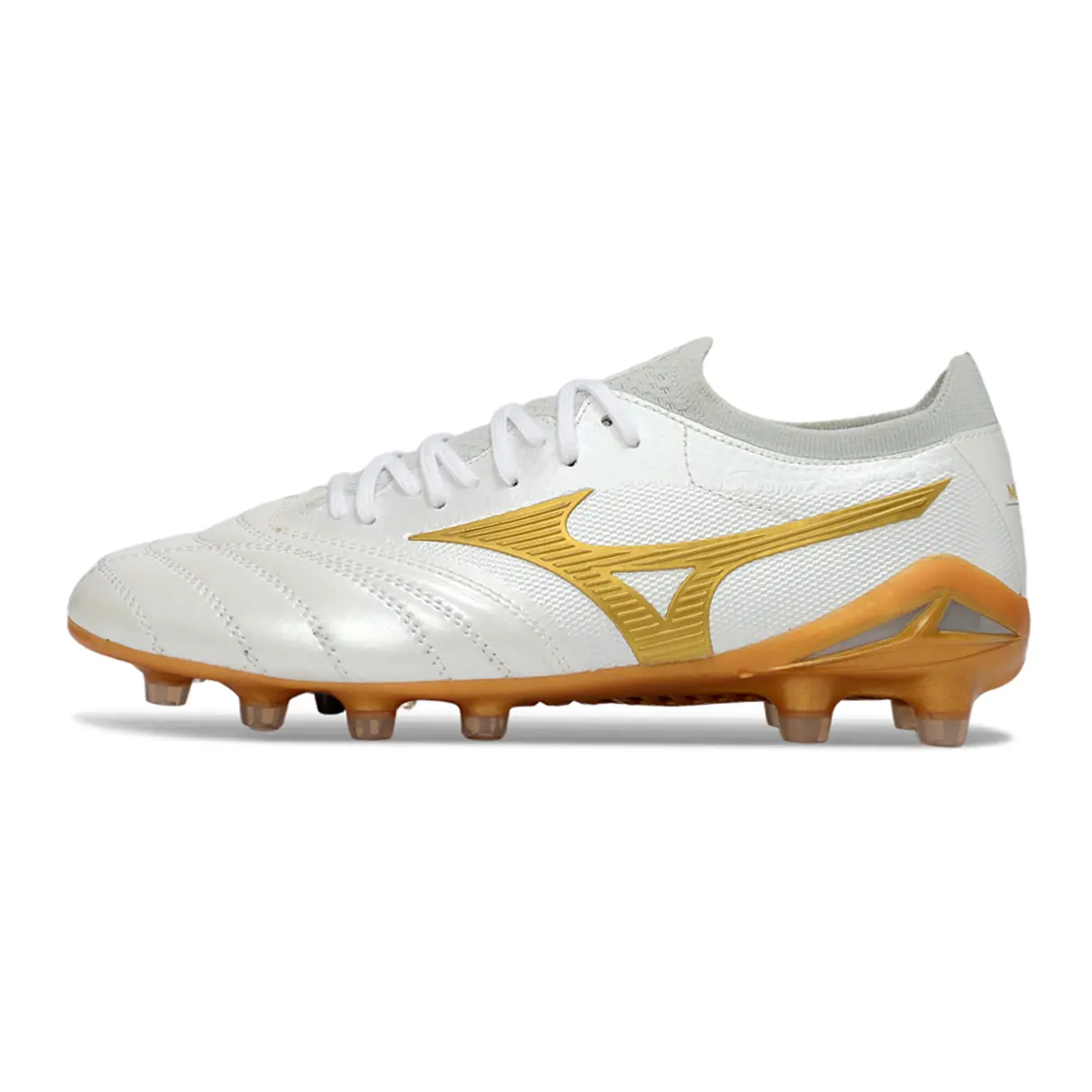 Chuteira Campo Mizuno Morelia Neo 4 Beta FG – Branco e Dourado