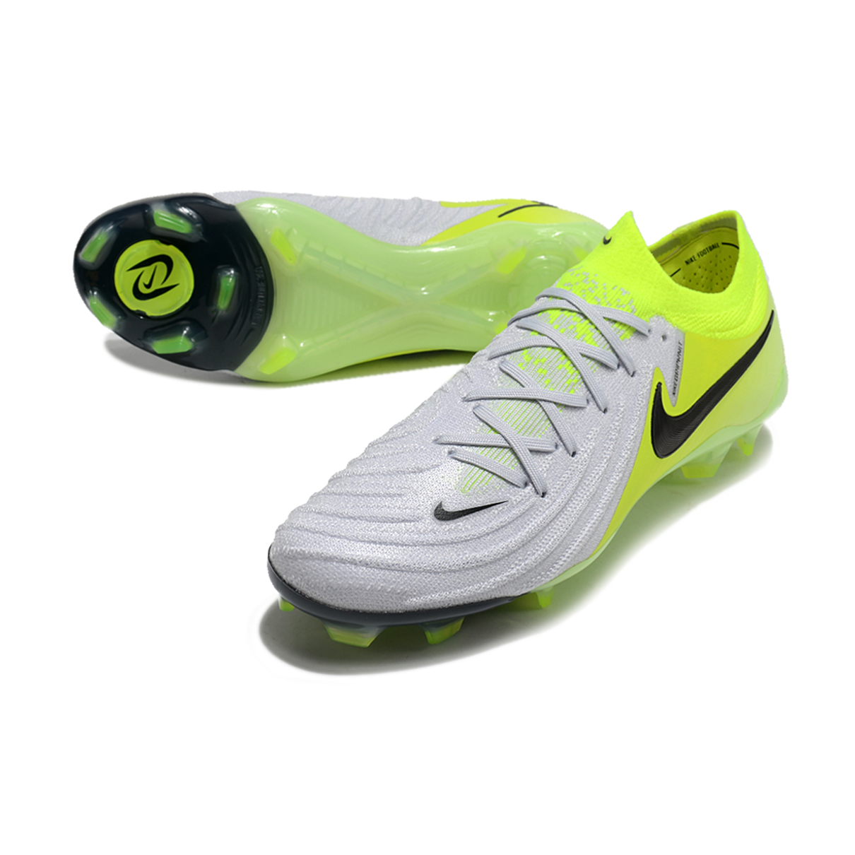 A Chuteira Nike Phantom GX 2 Elite FG na combinação de cores cinza e verde, conhecida como "Mad Voltage", é projetada para jogadores que buscam excelência em campo.