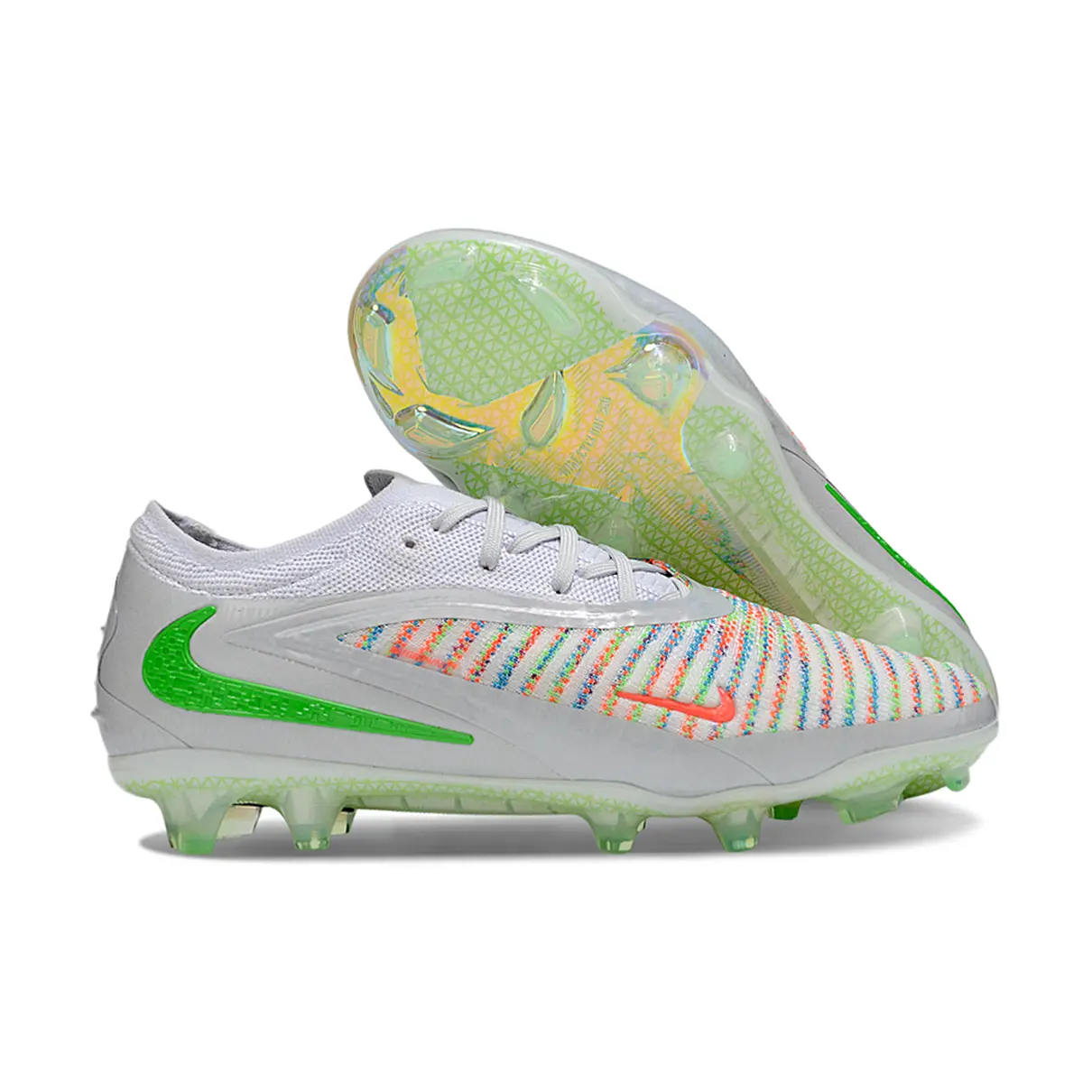 A Chuteira Campo Nike Phantom GX 6 Elite FG Prata, Verde e Laranja foi desenvolvida para jogadores que buscam controle de bola, agilidade e desempenho elevado em campos de grama natural. Com visual impactante nas cores prata, verde e laranja, esse modelo combina estilo marcante com performance técnica para quem quer decidir as jogadas com confiança.