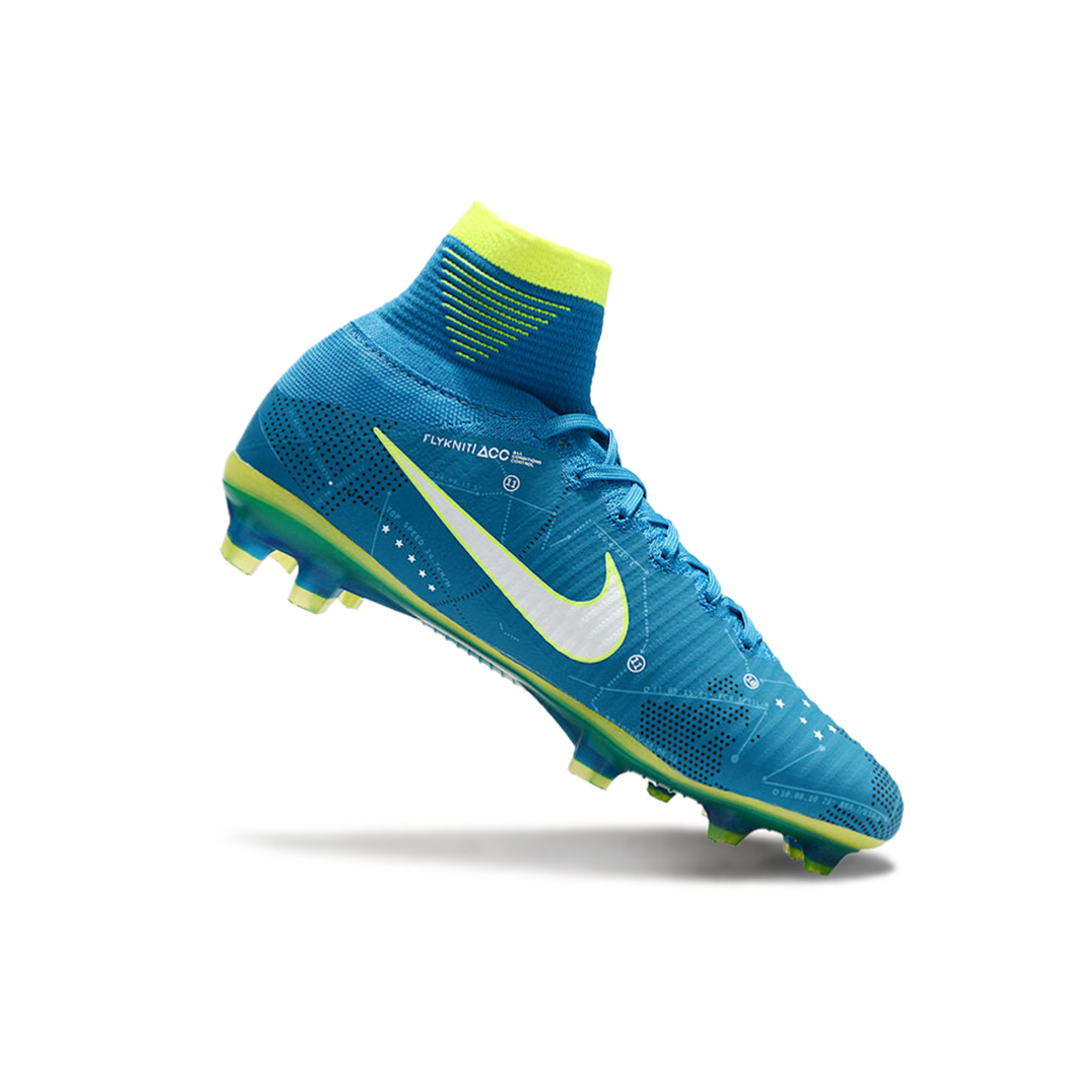 A Chuteira Campo Nike Retrô Mercurial Superfly 5 FG nas cores azul e verde combina estilo clássico e tecnologia moderna, perfeita para jogadores que buscam desempenho e estética em campo.