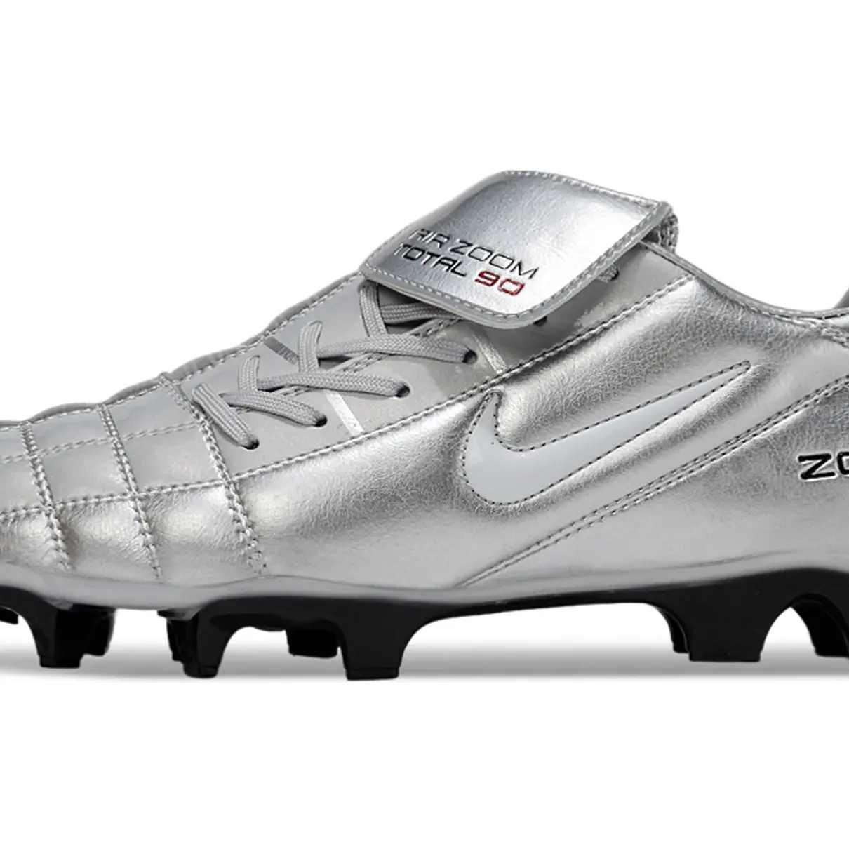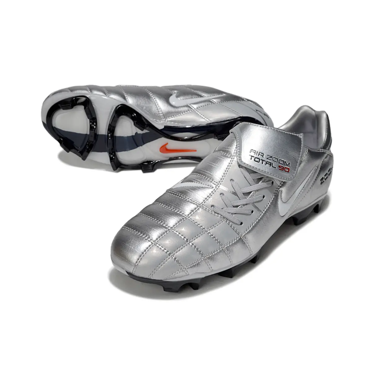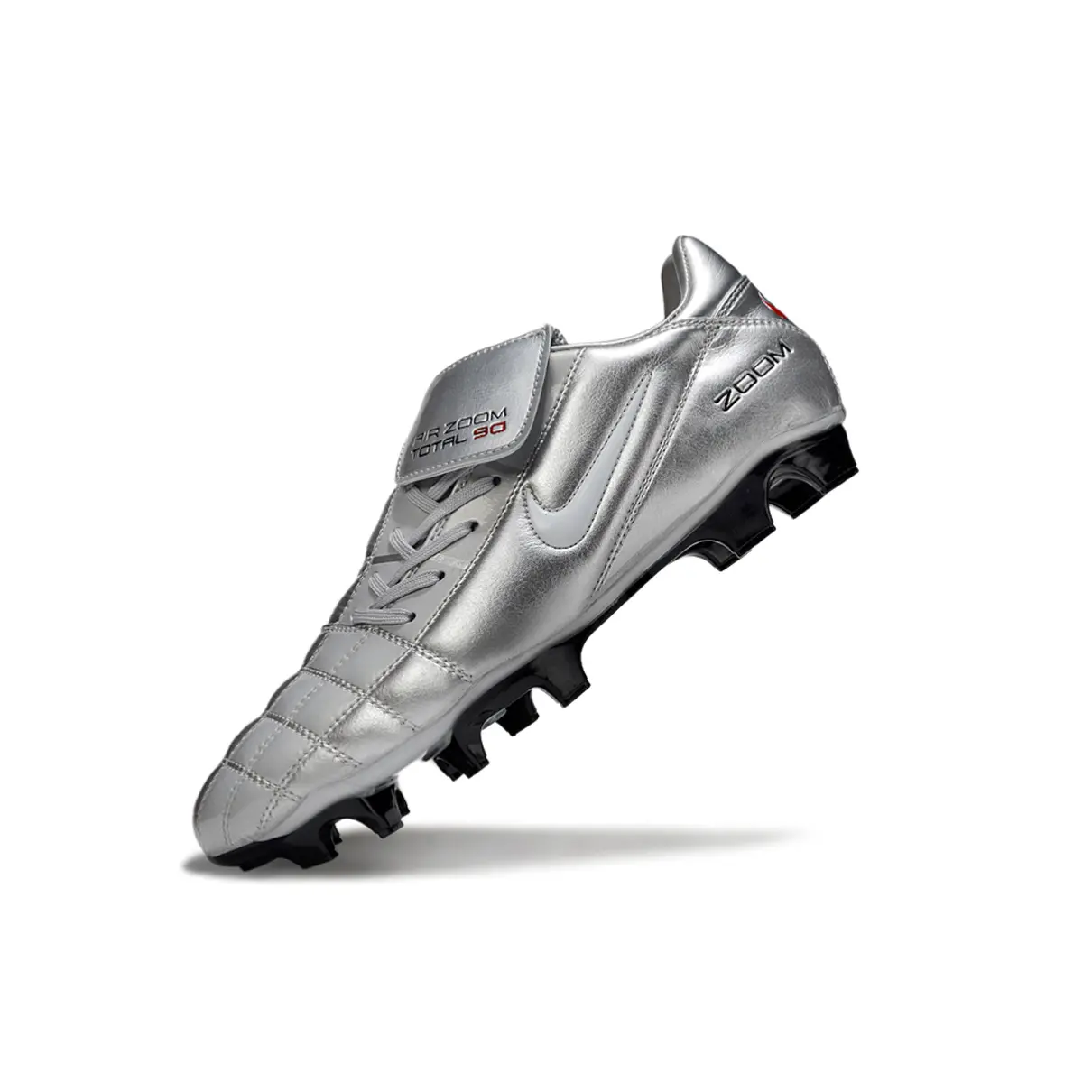 A Nike Total 90 ressurge com um visual poderoso em prata, branco, vermelho e preto, unindo nostalgia com performance moderna. Ideal para quem quer jogar com atitude e estilo, como nos velhos tempos — mas com tecnologia atual.