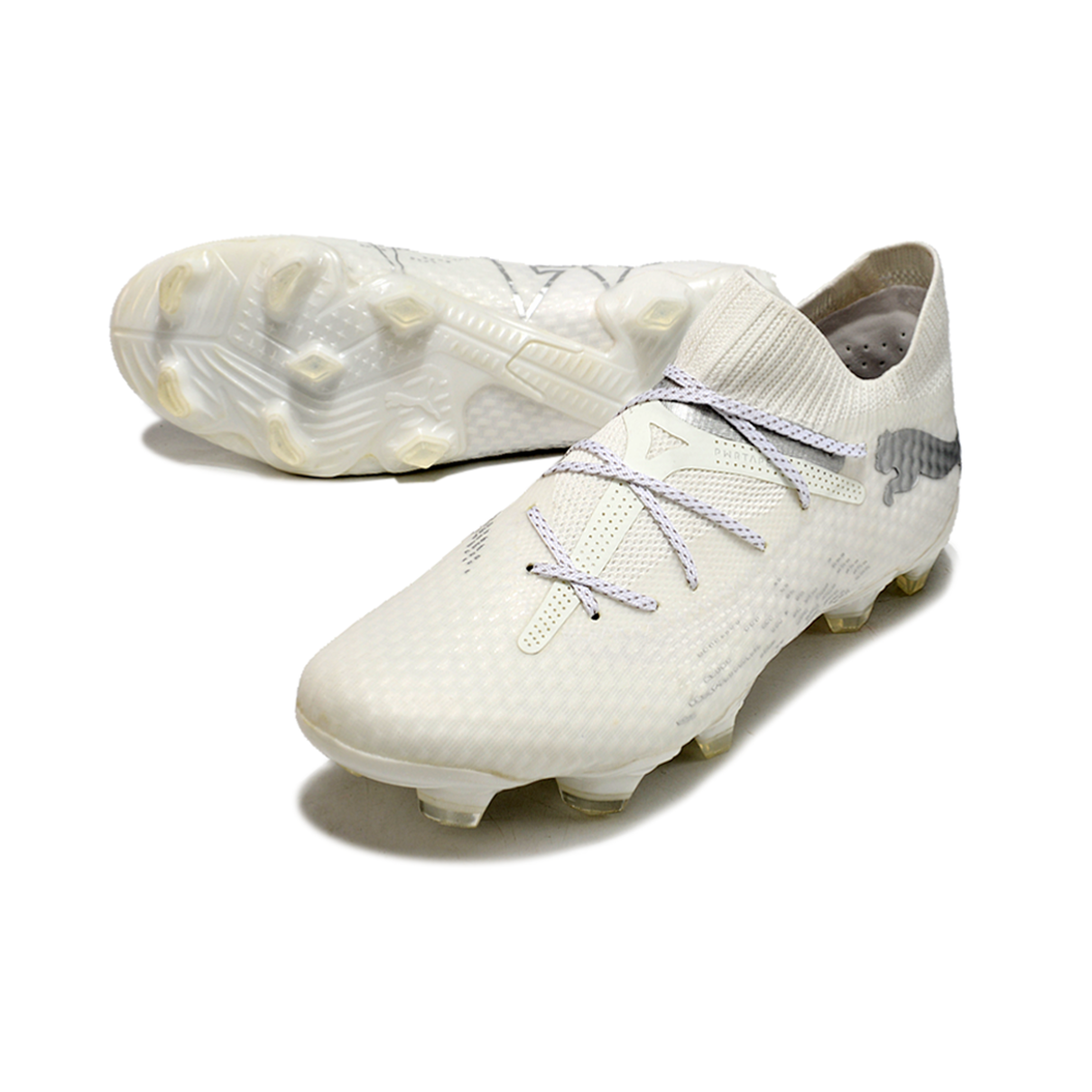 A Chuteira Puma Future 7 FG do "Eclipse Pack" é a escolha ideal para jogadores que buscam inovação e estilo em campo. Com um design elegante em branco e prata, esta chuteira combina performance e estética, perfeita para se destacar durante os jogos.