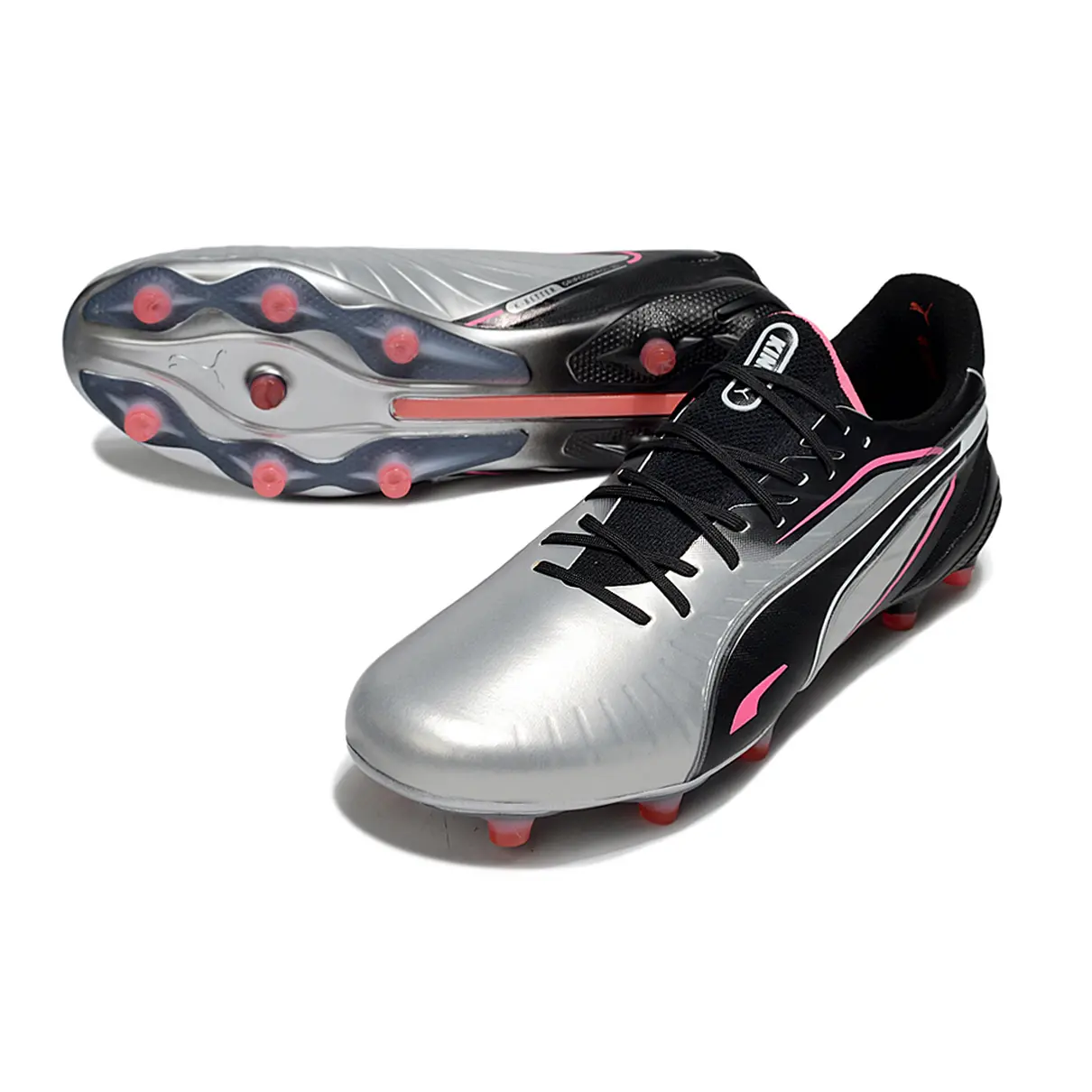A Puma King Ultimate FG "Audacity" traz a herança de uma das chuteiras mais clássicas da história do futebol, agora repaginada com visual moderno, tecnologia sustentável e performance de elite. Com uma combinação ousada de prata, preto e rosa neon, essa versão “Audacity” é feita para jogadores que não passam despercebidos — nem no estilo, nem no jogo.
