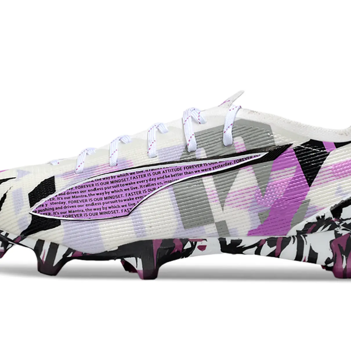 A Puma Ultra 5 Ultimate FG – Branco, Rosa e Preto é projetada para quem joga em velocidade máxima do início ao fim. Com um design aerodinâmico e ousado, ela combina leveza, explosão e controle para transformar cada arrancada em um diferencial decisivo no gramado.