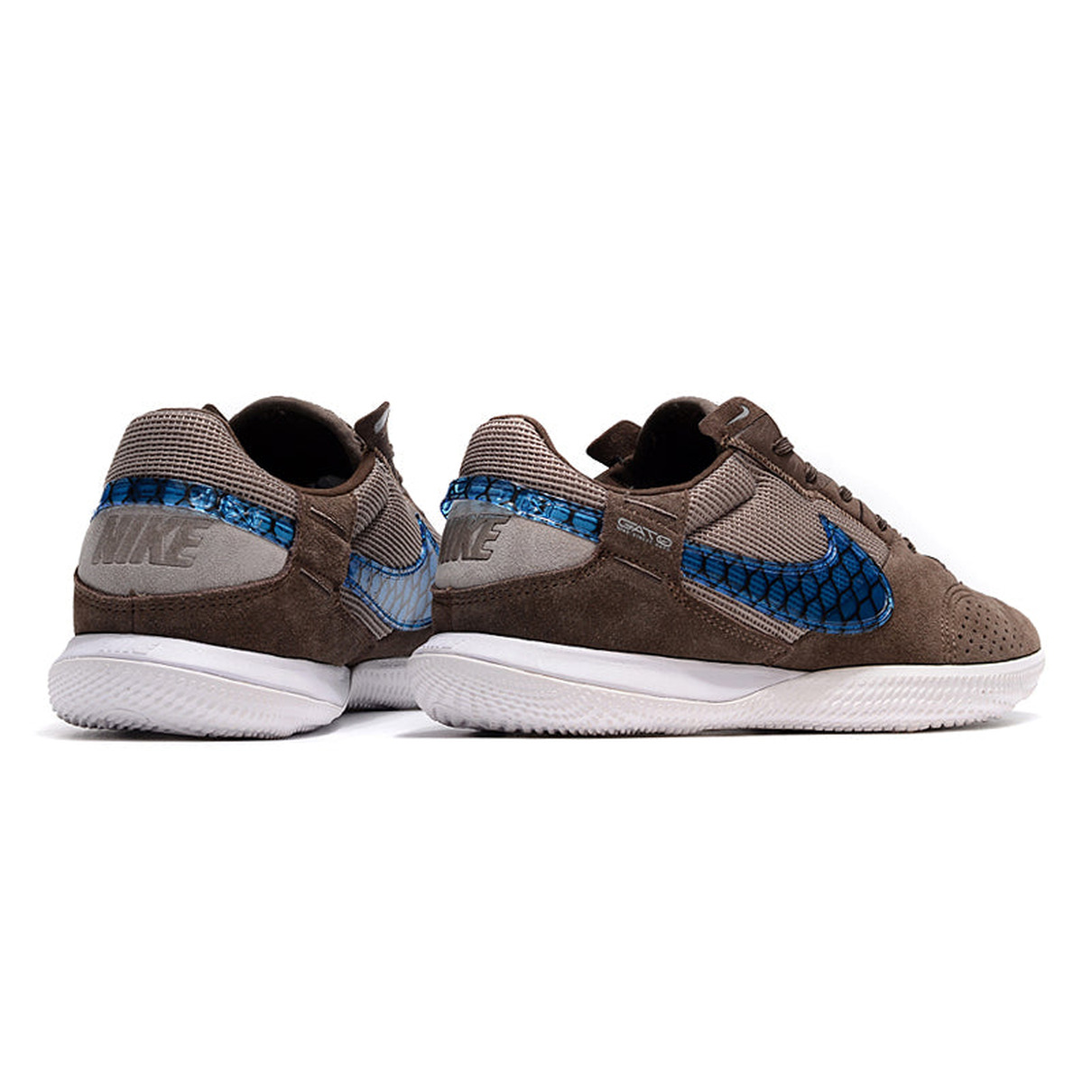 A fusão de cores marcantes, marrom e azul, não só adiciona um toque de estilo às suas jogadas, mas também oferece visibilidade e destaque enquanto você corta e dribla nas quadras. O design elegante e moderno da chuteira é complementado por detalhes de alta qualidade, que demonstram a excelência da marca Nike em cada aspecto.