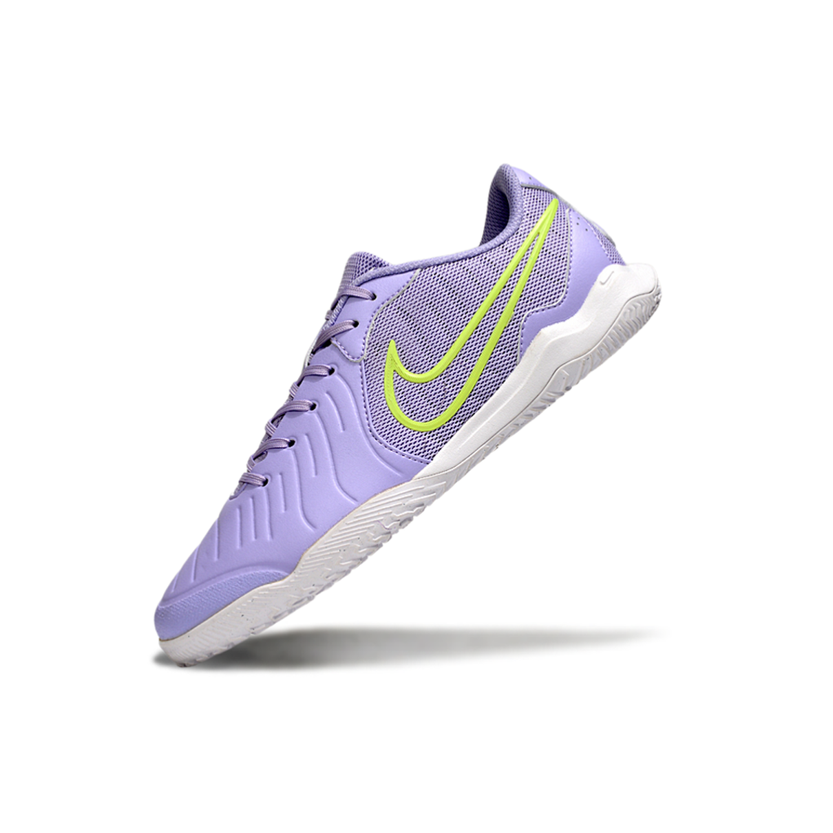 Cabedal sintético durável e texturizado, com combinação de roxo intenso e verde vibrante, garantindo estilo e sensibilidade no toque de bola;
