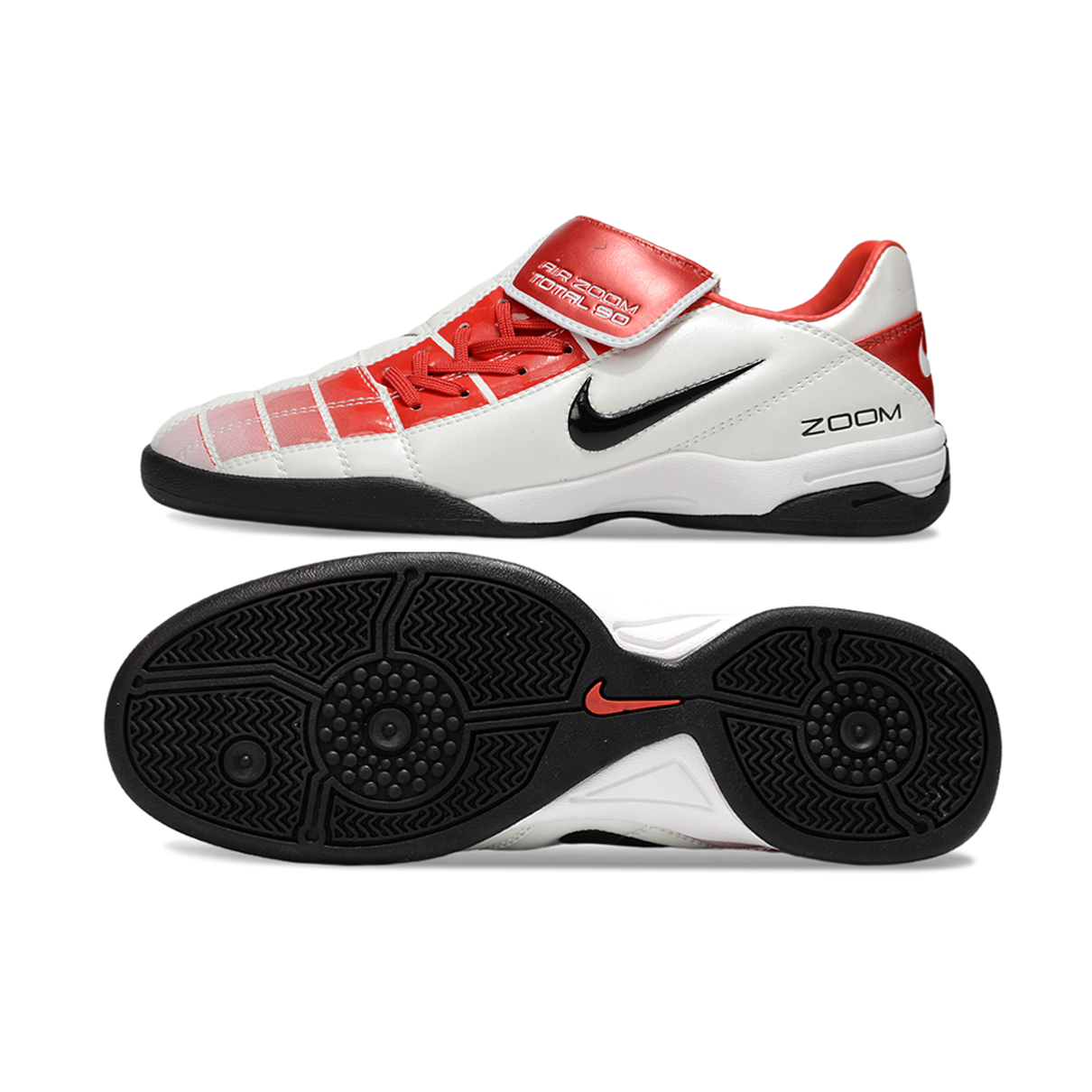 A Nike Total 90 IC Branco e Vermelho foi desenvolvida para oferecer máximo desempenho nas quadras de futsal. Seu cabedal em material sintético proporciona toque de bola refinado, aliando leveza e resistência para suportar a intensidade dos jogos. O cadarço assimétrico amplia a área de impacto, garantindo maior precisão nos passes e finalizações.