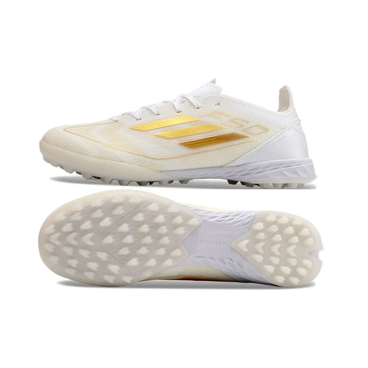 Material Superior: A parte superior da chuteira é feita de material sintético de alta qualidade, que proporciona durabilidade e resistência ao desgaste. O acabamento em branco é complementado com detalhes dourados que adicionam um toque de elegância.