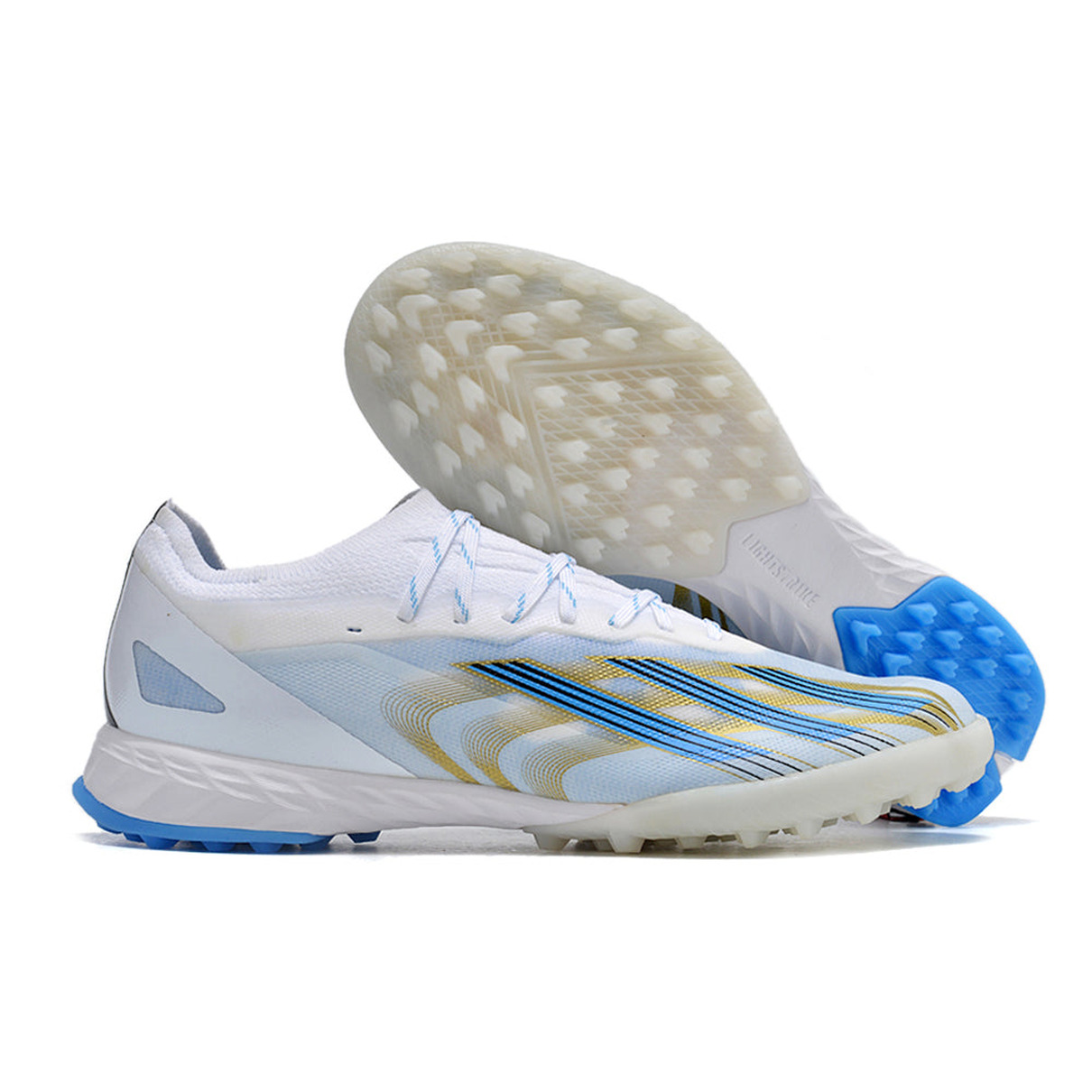 Chuteira Society Adidas X CrazyFast.1 TF Branca, Azul e Dourada "Las Estrellas"
