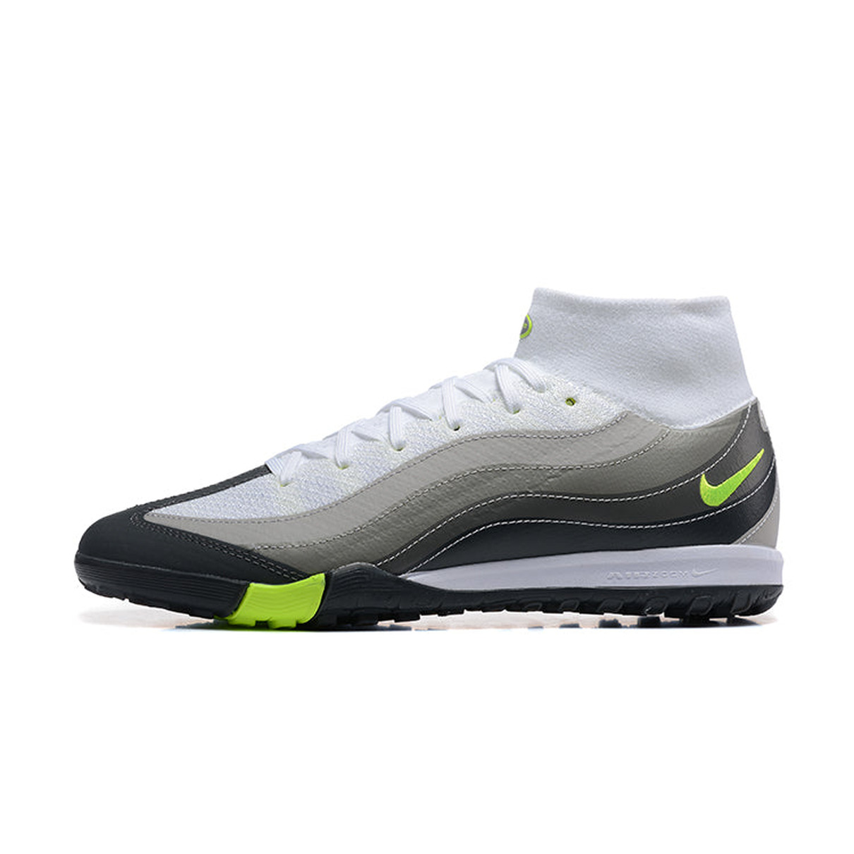 Explosão de velocidade com um toque de elegância. A Nike Air Zoom Mercurial Superfly 10 Elite TF na combinação branco, cinza e verde entrega um visual moderno com performance de elite para os craques da grama sintética.
