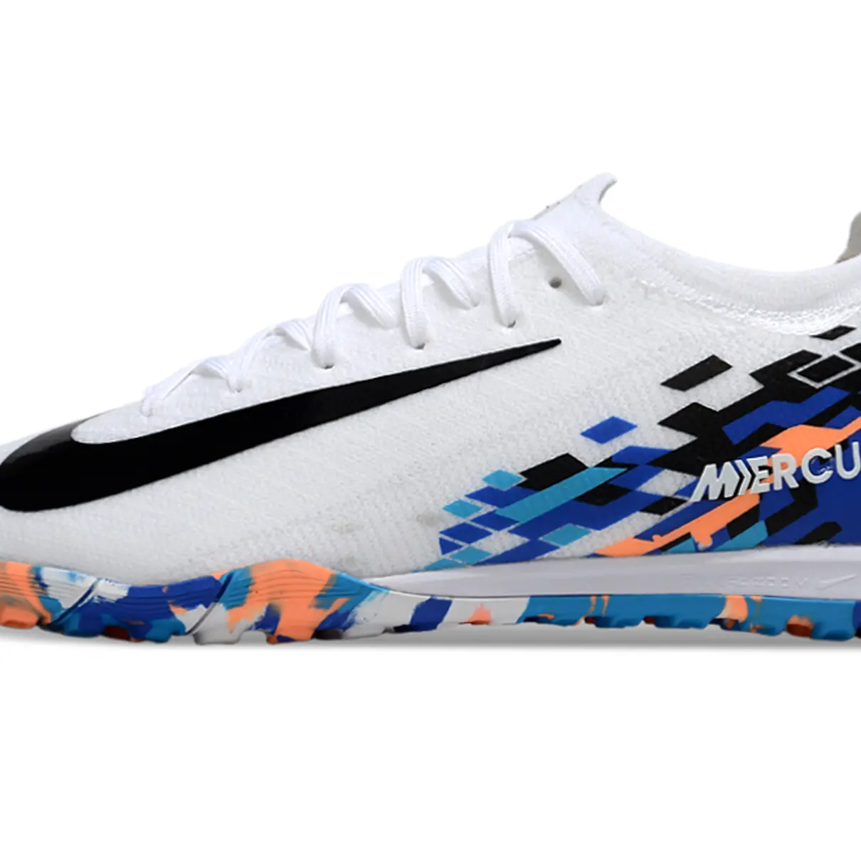 A Nike Air Zoom Mercurial Vapor 16 Elite TF – Branco, Azul, Laranja e Preto é a escolha perfeita para jogadores que vivem o jogo em alta rotação. Nesta versão com visual marcante e multicolorido, ela oferece velocidade, controle e tração de elite para partidas em gramado sintético.