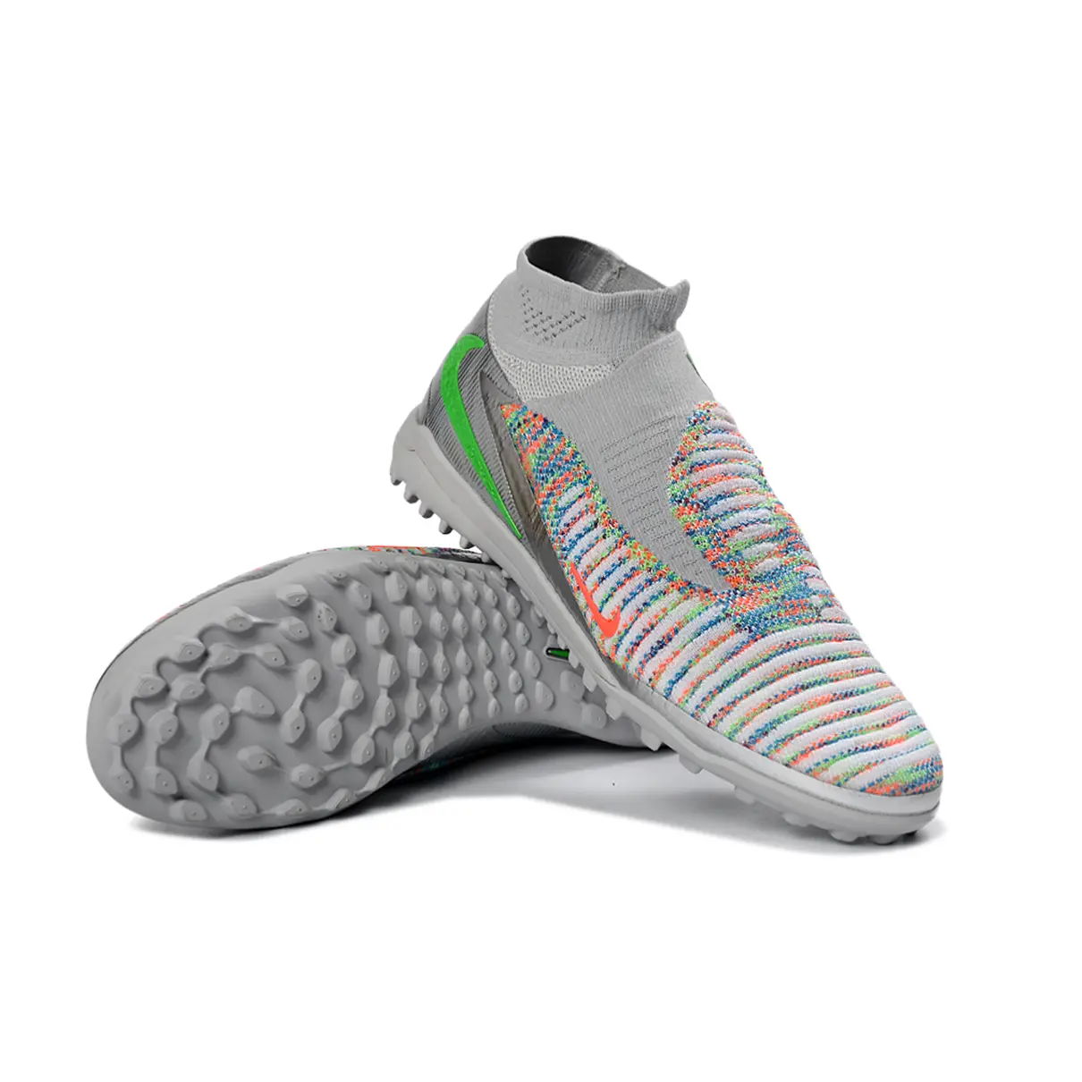 Chuteira Society Nike Phantom 6 DF Elite TF – Prata, Verde e Laranja