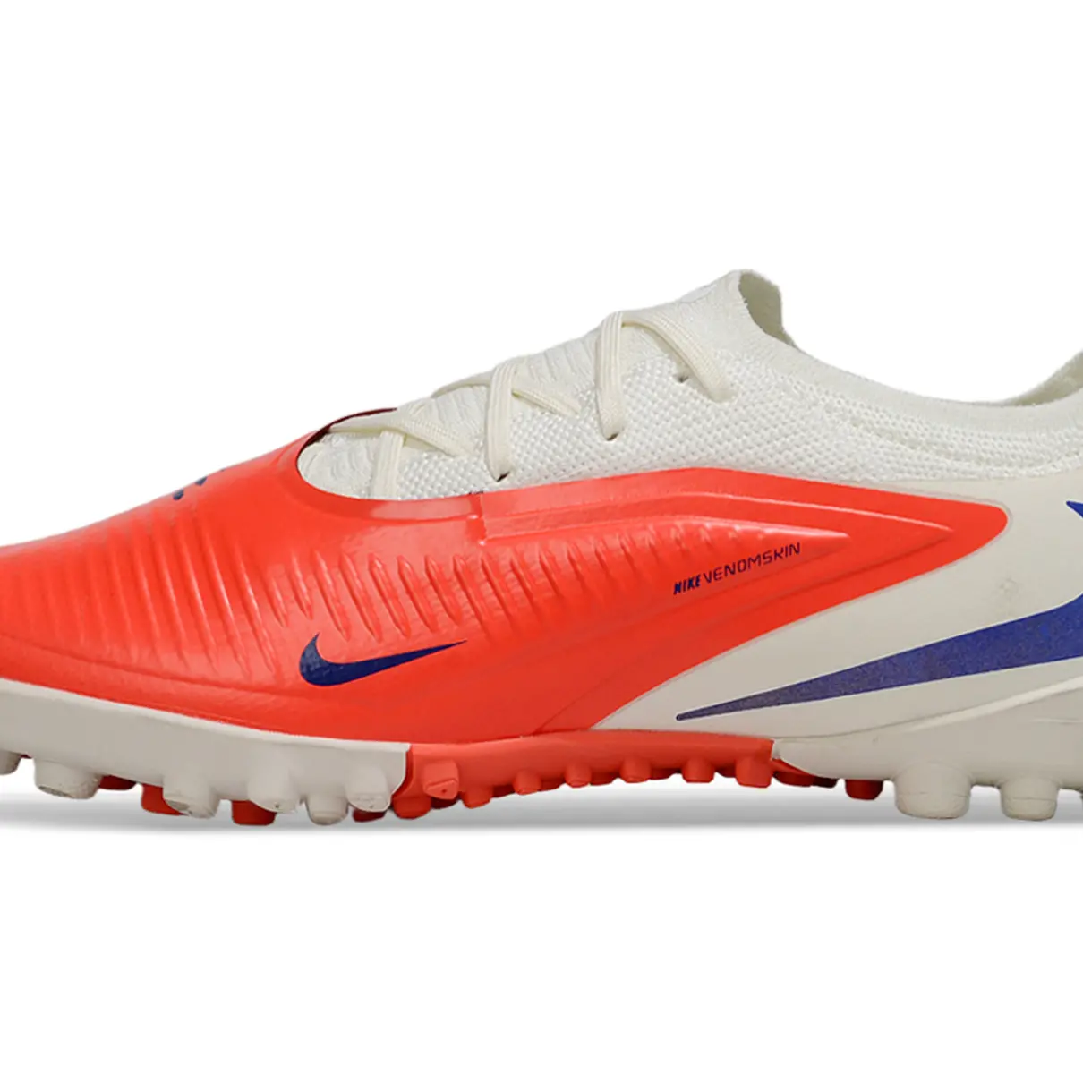 A Chuteira Society Nike Phantom ReactX 6 Pro TF Branco, Laranja e Azul é a escolha certa para jogadores que buscam controle, agilidade e conforto em partidas no gramado sintético. O cabedal texturizado proporciona maior precisão no toque e condução da bola, enquanto a entressola equipada com tecnologia ReactX garante amortecimento responsivo e conforto duradouro.