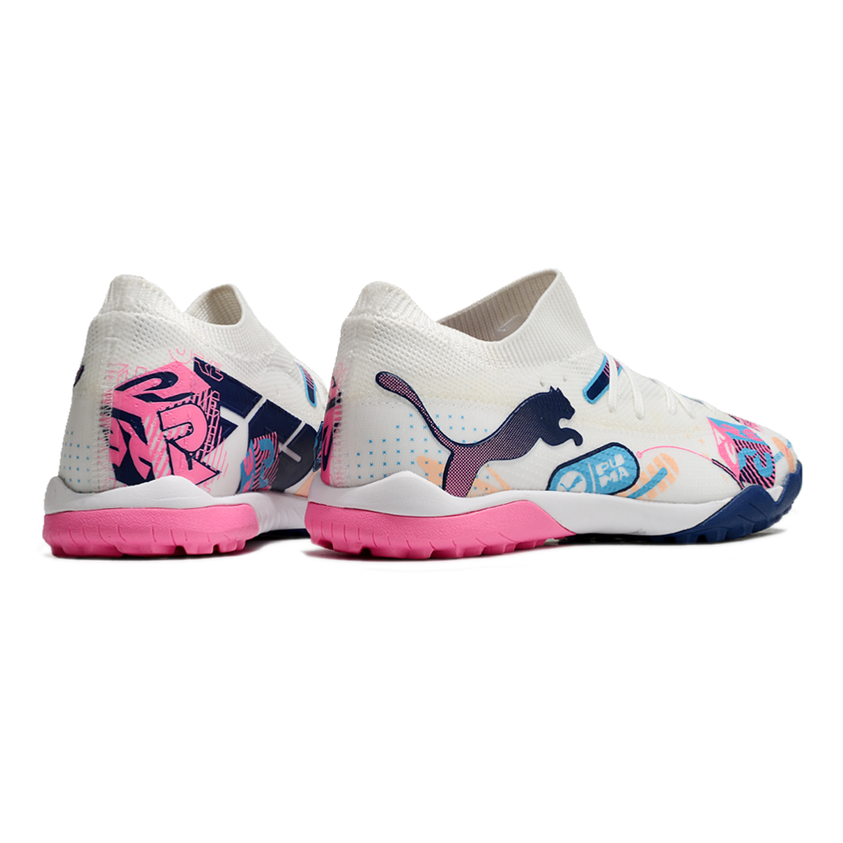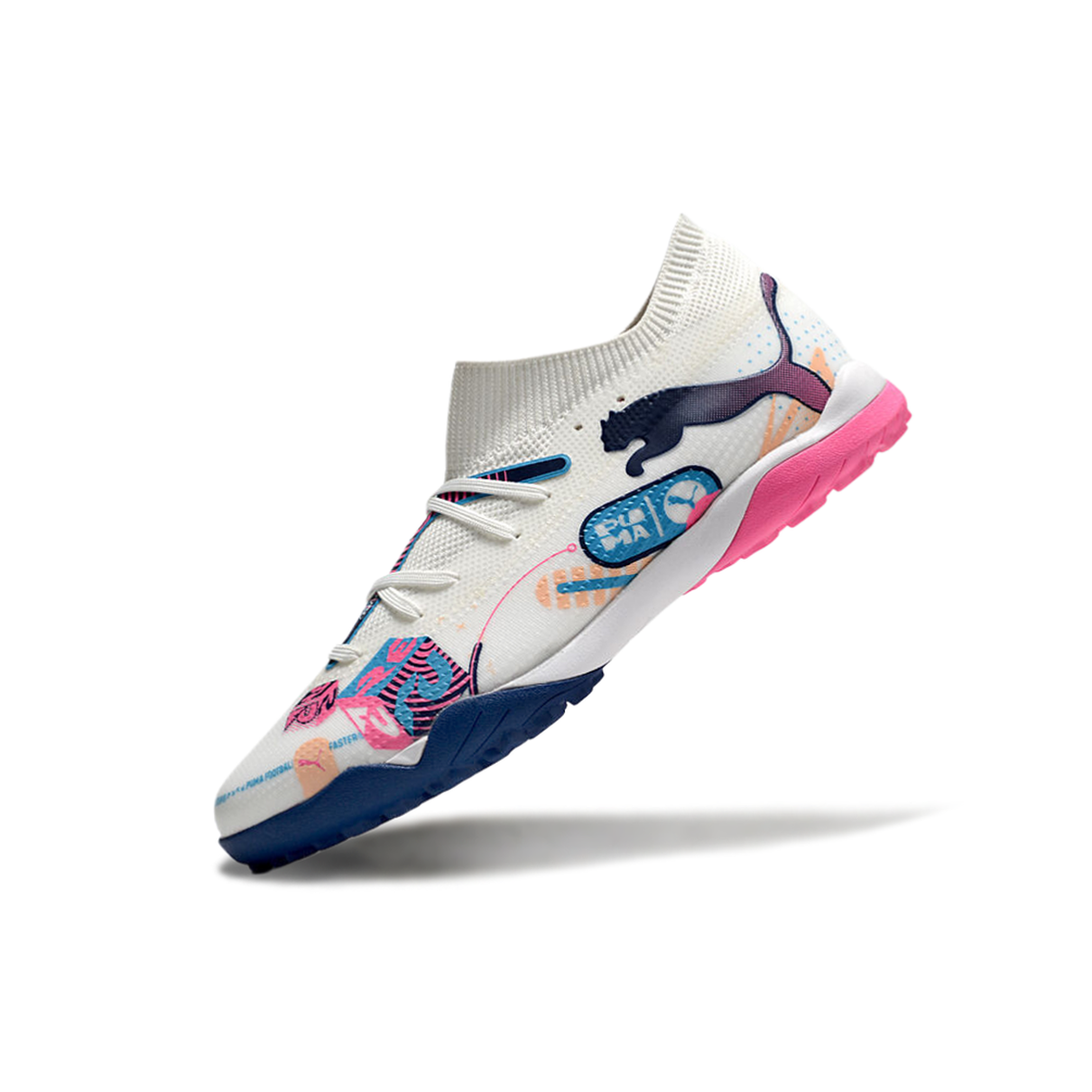 A Chuteira Society Puma Future 7 TF do "Volume Up Pack" é feita para os jogadores que desejam se destacar em campo, combinando estilo vibrante e tecnologia avançada. Com um design ousado em branco, azul e rosa, essa chuteira oferece performance e conforto para quem busca o melhor no futebol society.