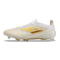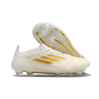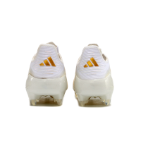 Design Elegante: O modelo "Day Spark Pack" apresenta uma combinação sofisticada de branco e dourado. O acabamento em dourado dá um toque de brilho e elegância ao visual predominante em branco, tornando essa chuteira uma peça destacada em campo.