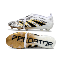 A Predator FT 30 Elite FG chega em uma combinação luxuosa de branco, preto e dourado, perfeita para quem se destaca em campo com técnica e estilo. O cabedal sem cadarços garante controle absoluto da bola e um toque limpo, ideal para passes precisos e finalizações letais.