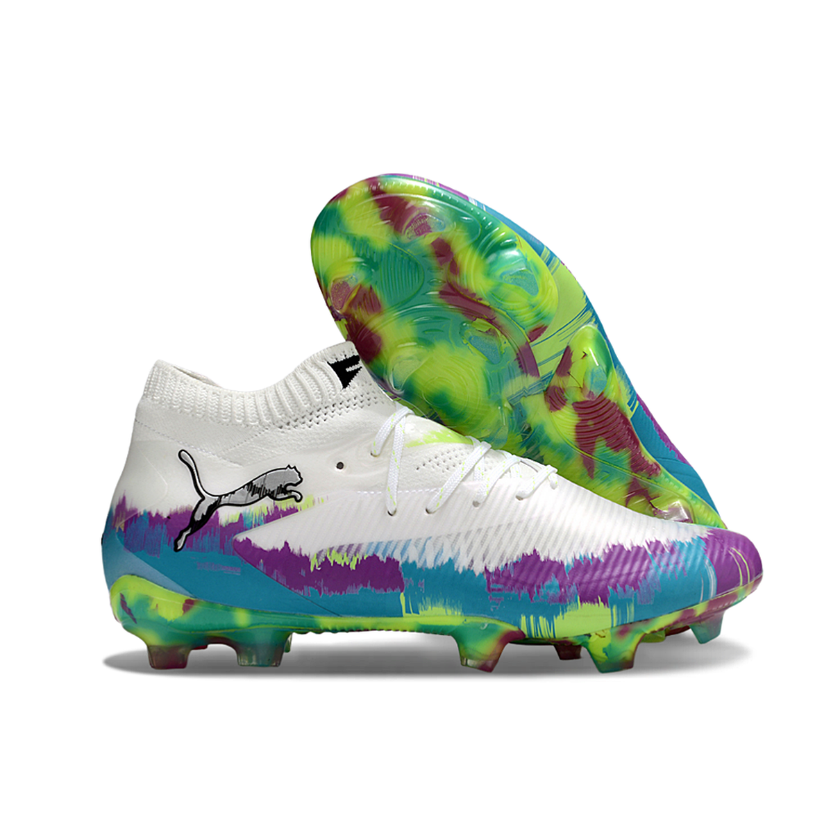 Chuteira Campo Puma Future 8 FG Branca, Roxa, Azul e Verde "Brilliance Pack"