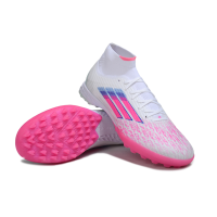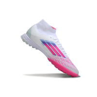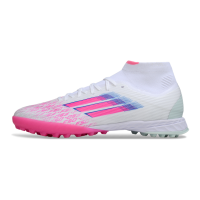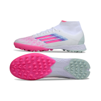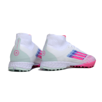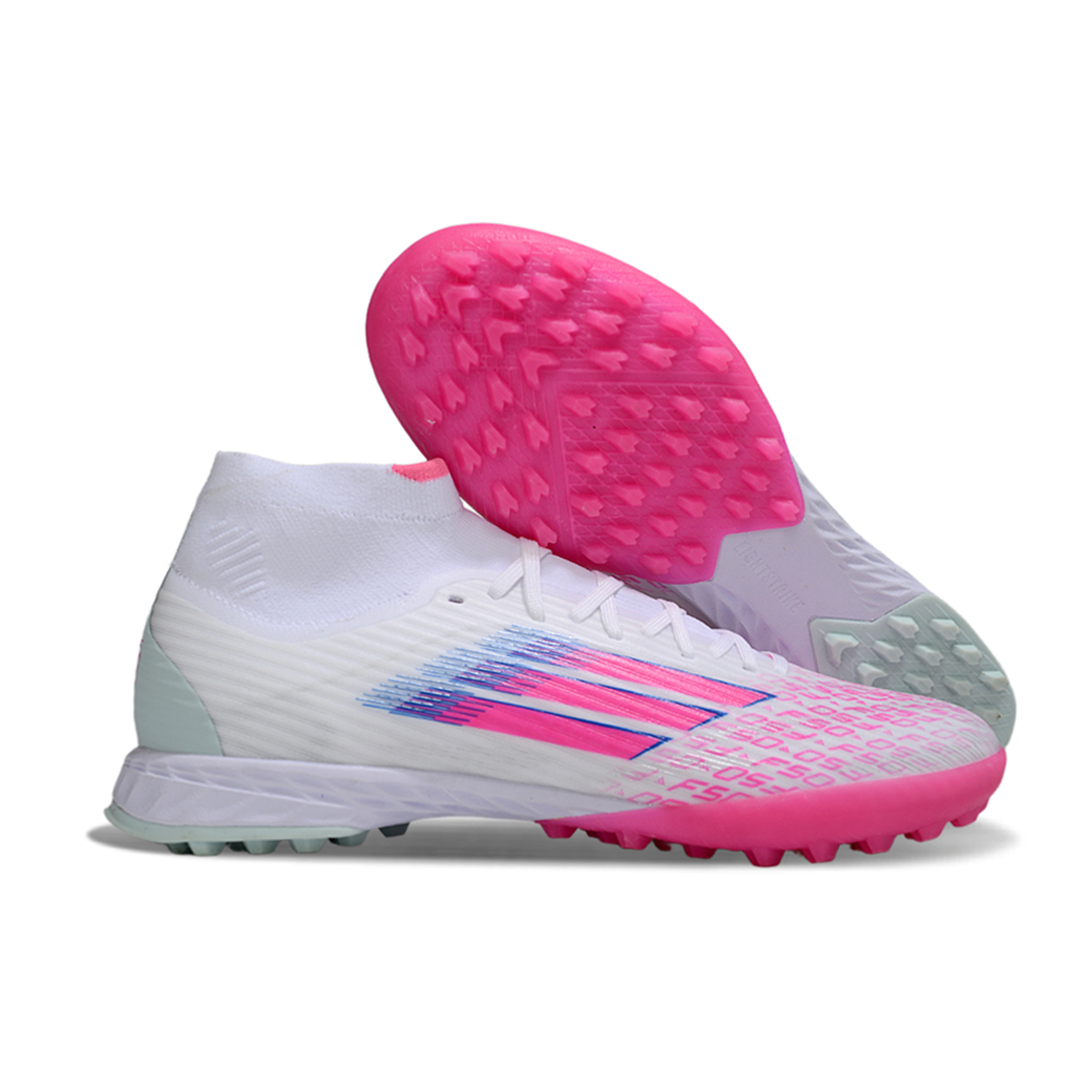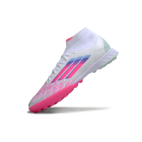 Chuteira Society Adidas F50 Cano Médio TF Branco, Rosa e Azul