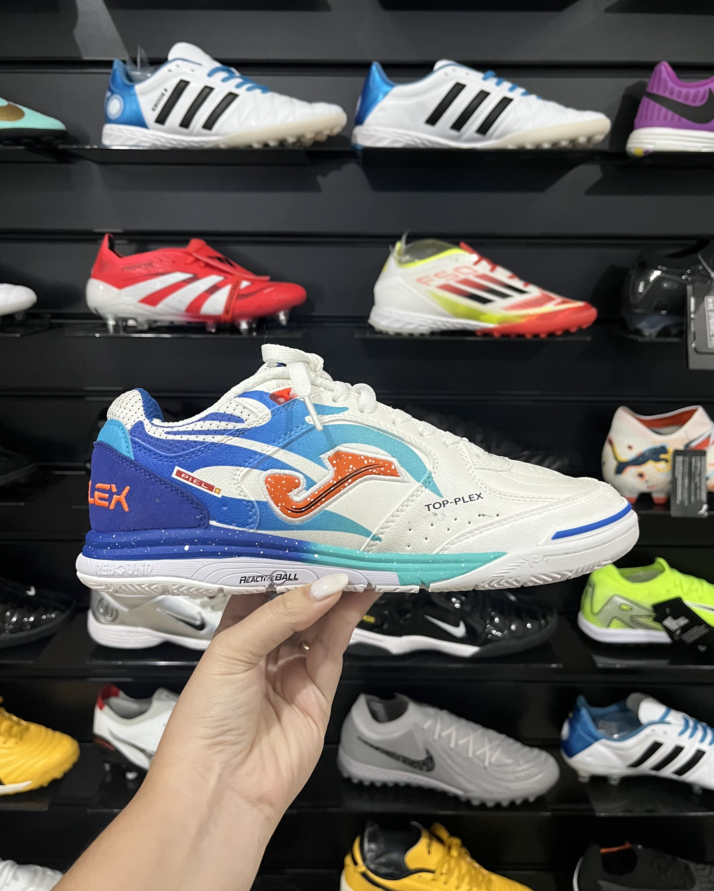 Chuteira Futsal Joma Top Flex Rebound IC Branco, Azul e Laranja - Pronta Entrega
