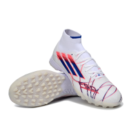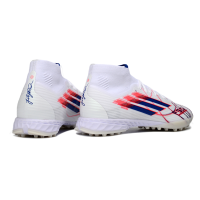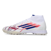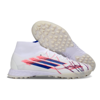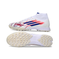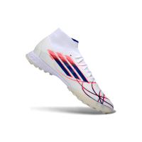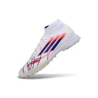 Chuteira Society Adidas F50 Cano Médio TF Branco, Azul e Vermelho